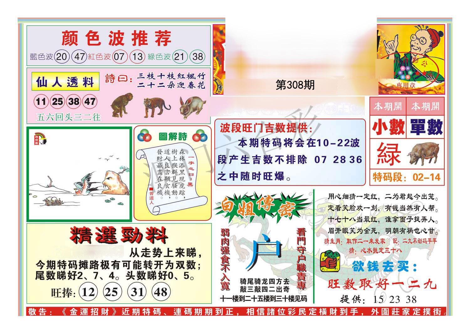 307期金牌波色【绿波】开:龙38准 |