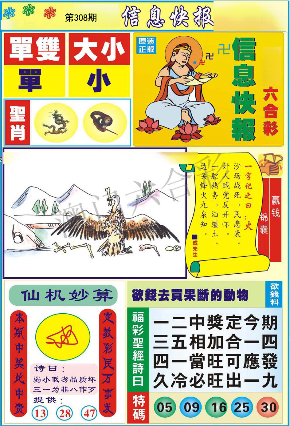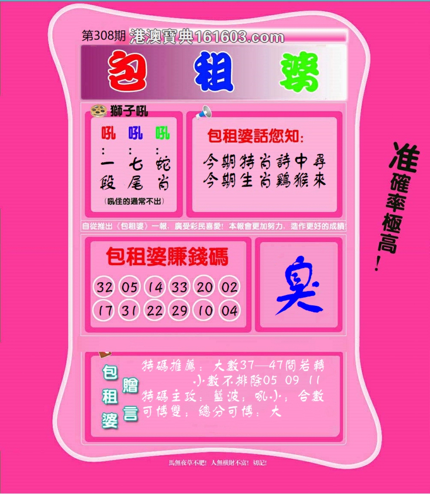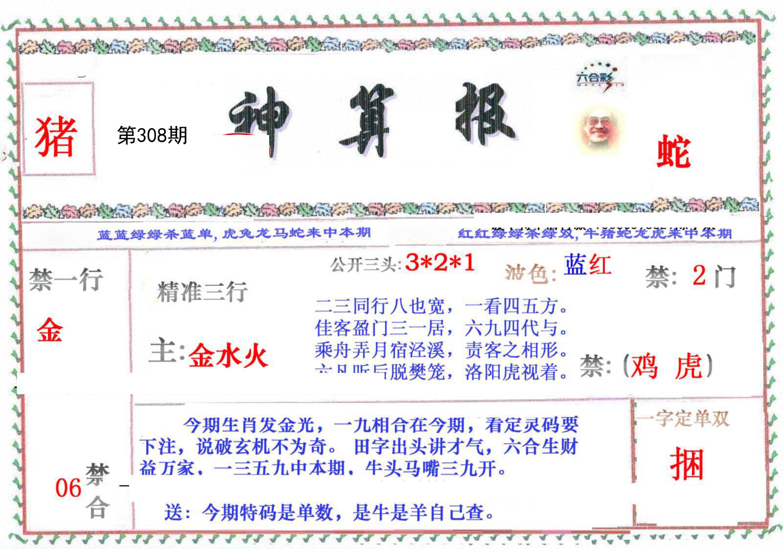 | 308期:【单数+蛇羊猴牛】开:?00准 |